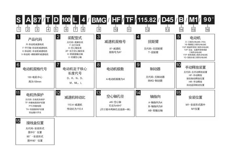 1、確定減速機安裝位置:M1,M2,M3,M4,M5,M6(關系到加油量);2、電機接線盒角度:0°、90°、180°、270°(關系到安裝和接線);3、電機出線口位置1、2、3、(正常位置不標:出線口朝下);4、出軸方向的確定;5、參數:功率,轉矩,速比,使用系數,環(huán)境溫度等;6、RF系列輸出法蘭直徑有2-3種(涉及客戶安裝工位,具體參考樣本);7、SA47-SA97有兩種空心軸徑尺寸(關系到安裝);8、輸出旋轉方向,可以根據電機接線調整,不需要刻意備注CW/CCW。