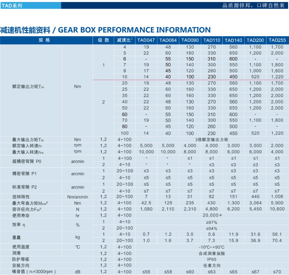 • 產(chǎn)品簡介:TAD系列減速機斜齒型結(jié)構(gòu)精密減速機.高扭矩高剛性高精度輸出(高效率低噪音)低背隙.定位精度高 產(chǎn)品規(guī)格:042、060、090、115、142、180、240、330 產(chǎn)品背隙: P2:標準背隙單節(jié)≤5弧分雙節(jié)≤7弧分 P1:精密背隙單節(jié)≤3弧分雙節(jié)≤5弧分 P0:超精密背隙單節(jié)≤1弧分雙節(jié)≤3弧分 單段速比:3——10 雙段速比:12——100 高效率 單節(jié):≧97% 雙節(jié):≧94%